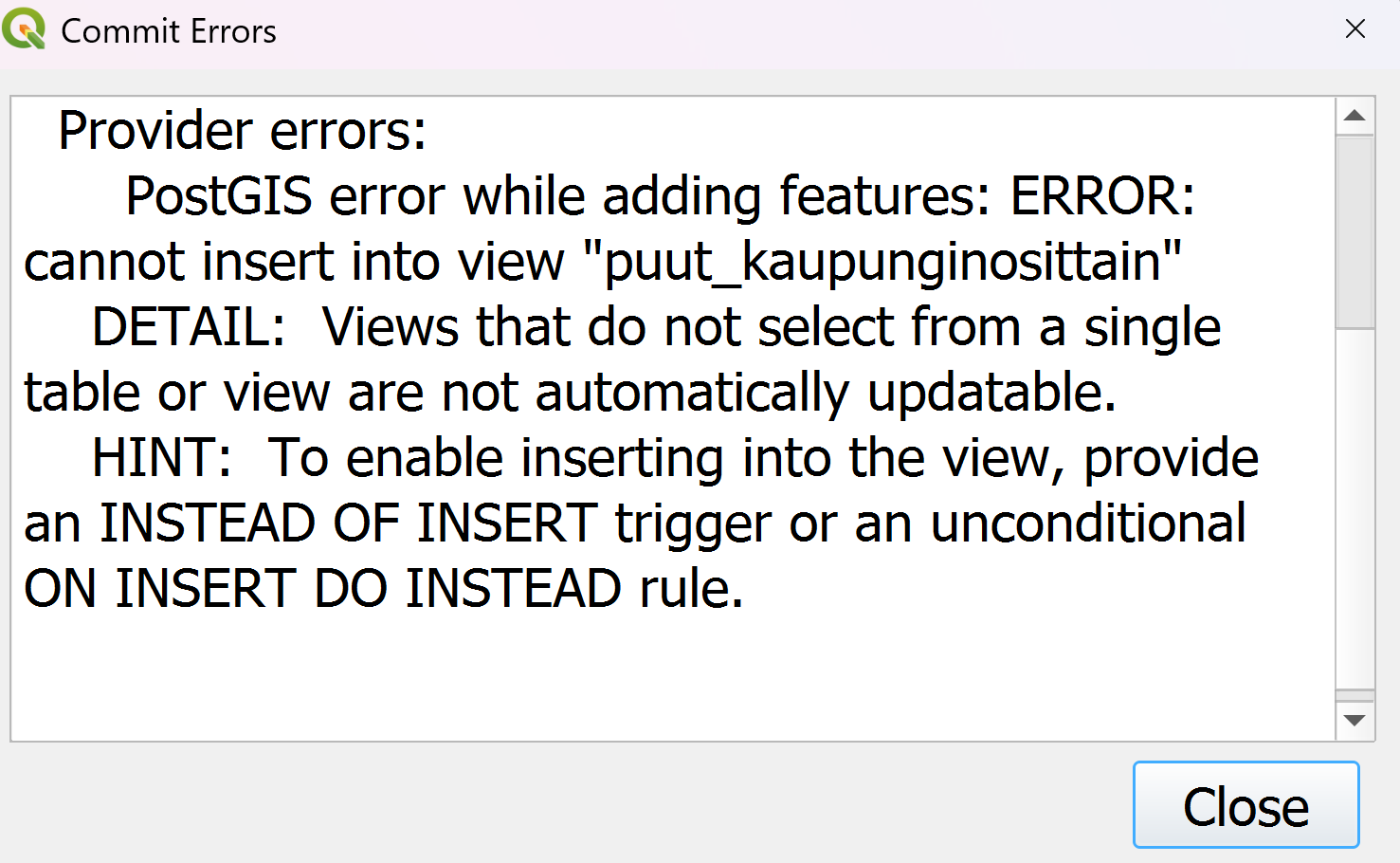 Loimme aiemmassa harjoituksessa yksinkertaisen näkymän “puut_kaupunginosittain”. Mikäli koitit muokata kohteita tämän näkymän kautta esimerkiksi pgAdminin tai QGISin kautta, tulit huomaamaan että muokkauksia tallentaessa (COMMIT) törmäsit virheeseen: