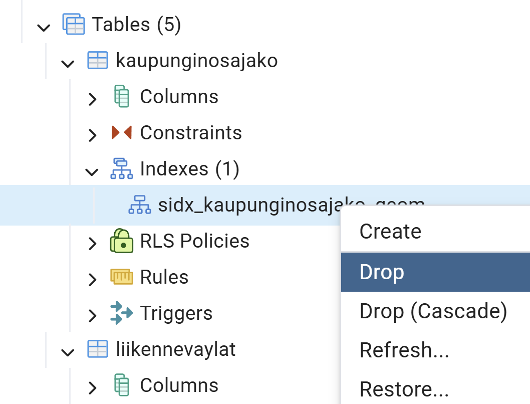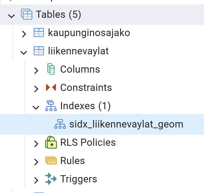 DROP INDEX <indeksin nimi>;Aja EXPLAIN ANALYZE -kysely uudelleen. Tuleeko muutoksia? Poista vielä spatiaalinen indeksi liikennevaylat-taululta, ja vertaa tuloksia kyselyssä.