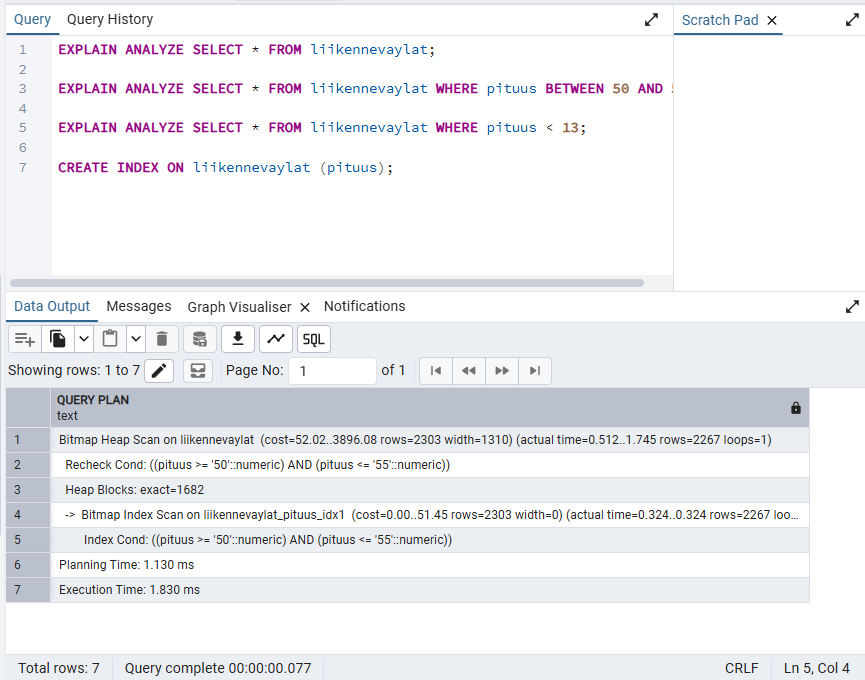 DROP INDEX liikennevaylat_pituus_idx;- Aja edellä annettuja kyselyjä nyt indeksin määrittelyn jälkeen ja vertaa saatuja tuloksia aiempaan. Miten query plan on muuttunut? Onko suunnittelu- ja ajoaika muuttunut jollain tavalla?